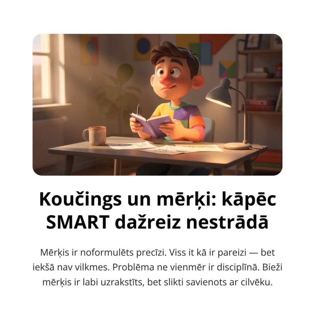 Taču problēma sākas tad, ja SMART kļūst par vienīgo ietvaru. Tad mērķis kļūst tehniski korekts, bet emocionāli tukšs. Tas izklausās sakārtots, bet neiededz. Un tad cilvēks sāk domāt, ka ar viņu kaut kas nav kārtībā. Patiesībā bieži nav kārtībā nevis cilvēks, bet mērķa konstrukcija.
